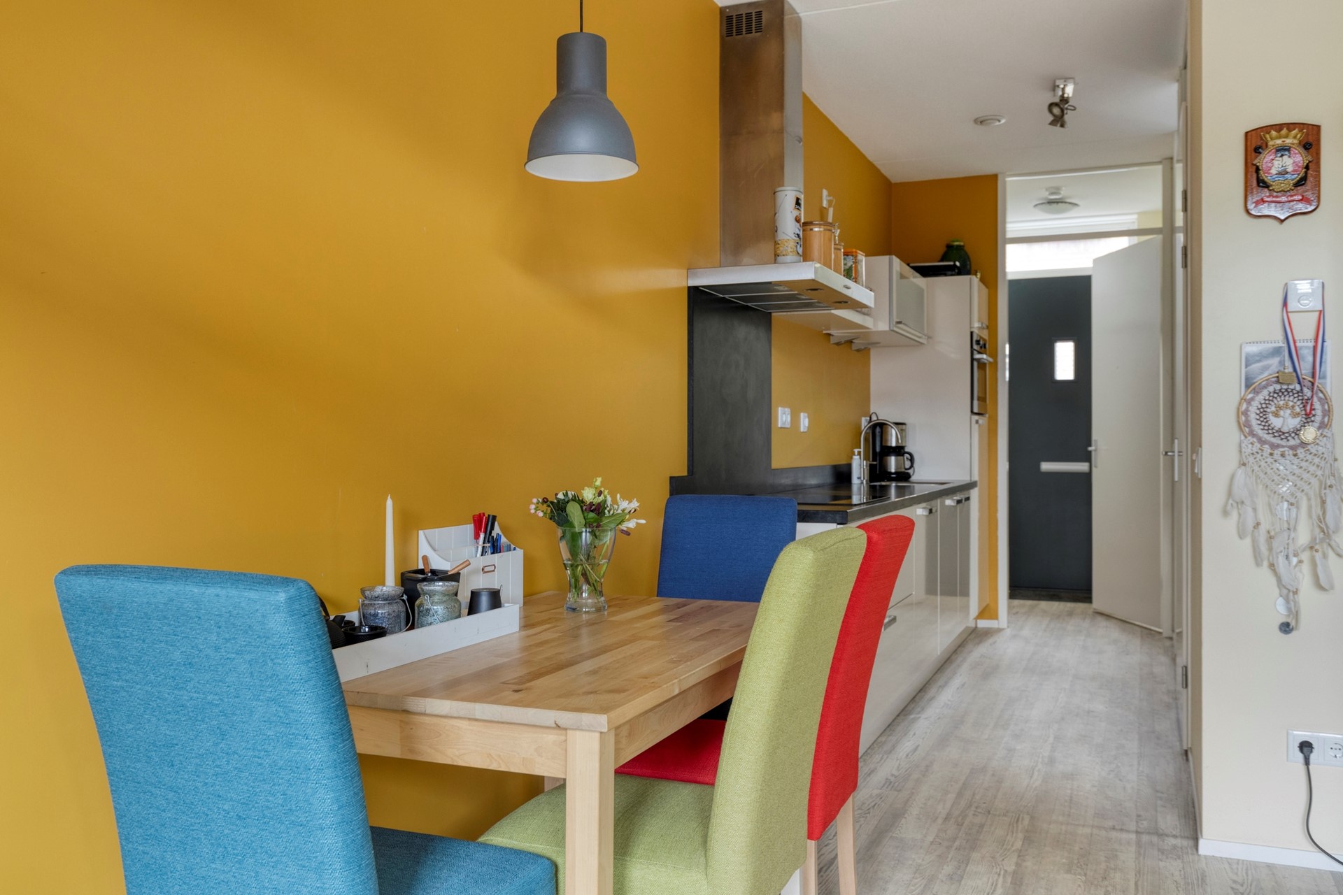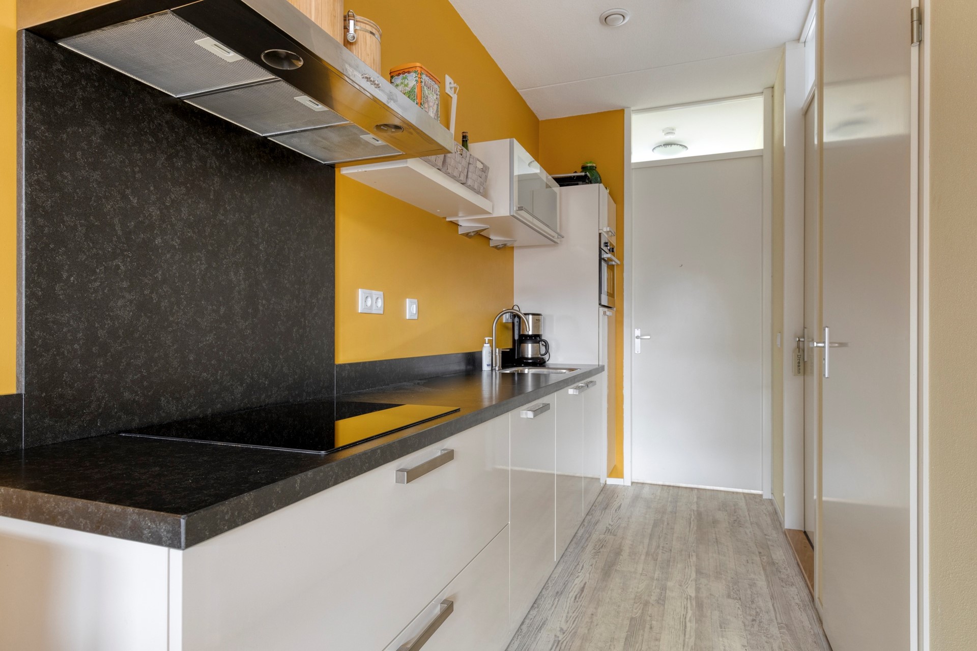 Via de entree kom je binnen in de keuken, die centraal in het appartement ligt en doorloopt naar de woonkamer.